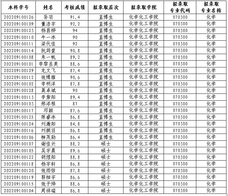 根据教育部及学校关于“强基计划”学生转段研究生相关规定,经学生申请、学院考核,现将色情导航 接收2022级“强基计划”学生本研转段考核结果予以公示,公示期为2025年9月24日-9月27日。如对拟录取名单有异议,请于公示期内向化学化工学院书面反映。