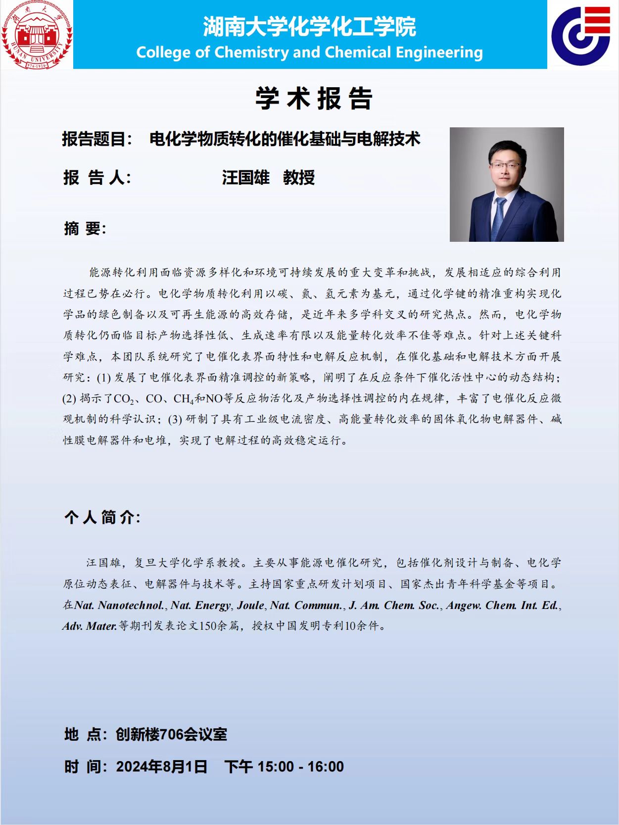 2024年8月1日复旦大学汪国雄教授学术报告会