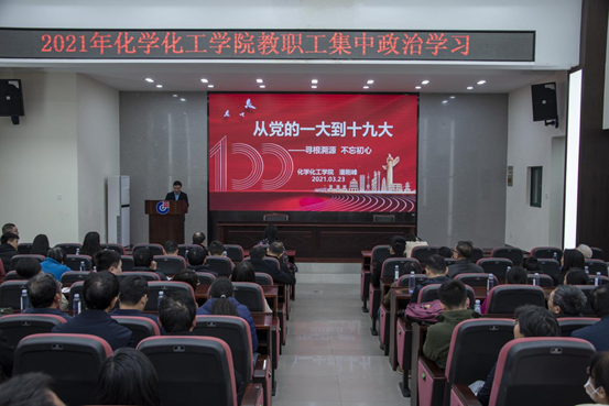 新化工楼D区报告厅开展。本次学习由院党委副书记潘刚峰主讲,学院全体教职工参与学习。