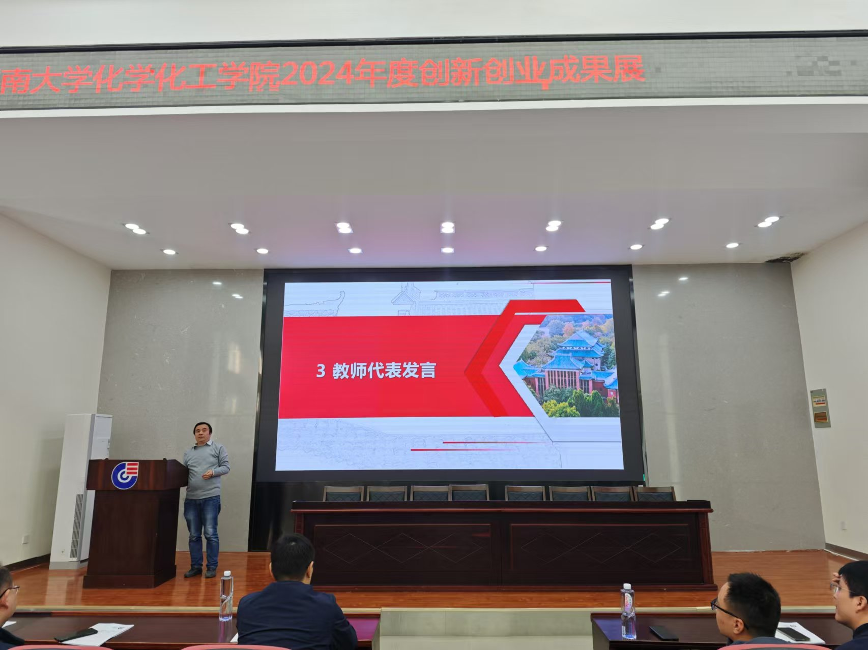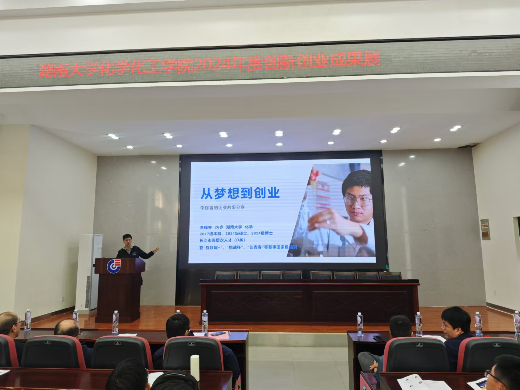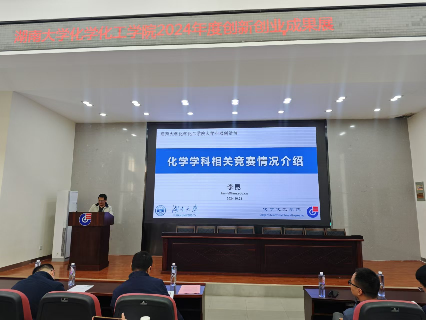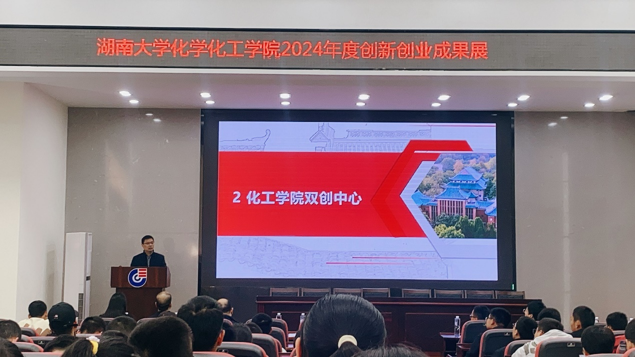 10月23日中午13:00点,学院在新化工楼D区报告厅隆重举办2024年度创新创业成果展活动。活动由学院双创中心主任金波主持,出席嘉宾包括书记王双印,副书记李洪玉,副院长李永军,院长助理罗潇、王少飞,竞赛指导教师代表朱建、李文生、李昆,辅导员王嘉琪、何妮翰,获奖学生代表李镓睿、高丽薇、浣海山,近300位本科生参加。活动包括学院双创中心概况、近五年创新创业回顾、教师代表发言、学生代表发言、书记讲话等环节。