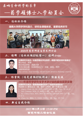 药学学科作为校内唯一医学博士点的多个研究方向及显著成果,详细讲解了研究生课程体系、开题、论文与答辩等培养环节,并隆重介绍了药学研究生的学术研讨会,鼓励新生夯实基础、勇于创新。随后,25级博士新生谢辉(导师冯欣欣)以“科学研究入门:文献、实验、写作”为主题,结合自身研究生经历,分享了读研期间的实用经验。他鼓励新生“保持好奇,持续学习,勇于挑战自我”,为科研之路注入动力。同时,会议特别邀请了2024年度药学研究生学术研讨会“最佳奖”获得者杨雪纯师姐(导师冯见君)进行经验交流,她用三段故事分享了自己的科研心路,回顾了初次参与科研合作时的探索,强调团队交流带来的共赢与成长;讲述了面对实验失败与自我怀疑的经历,在坚持中重新找到方向;分享了在“反应停事件”的启发下,持续努力迎来意外收获的惊喜。她鼓励新生不畏困难、主动合作、坚守初心。目前她已参与发表SCI论文7篇,其中(共)第一作者论文4篇,为新同学们树立了优秀榜样。